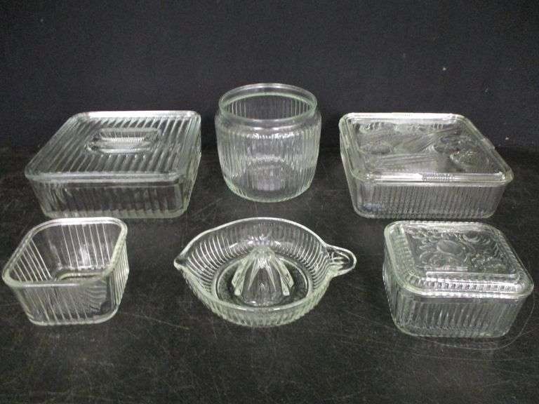 2 - Large Square Jars w/Lids (One Has A Chip On The Corner), 2 - Smaller Jars (One With Lid), Juicer, Cookie Jar (No Lid)