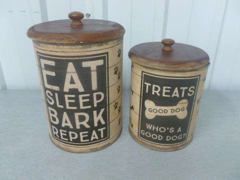 LOT 37 - (2) Piece Metal Dog Treat Canister Set With Wooden Lids