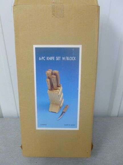 LOT 93 - New Interpur (6) Piece Wood Handled Knife Set With Block - Japan
