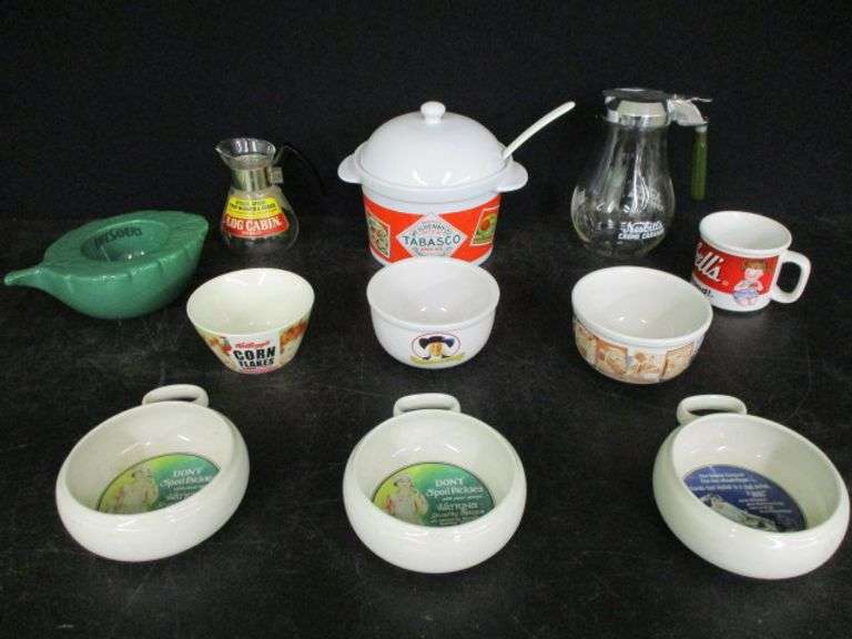 McIlhenny Tabasco Tureen, Nesbitt's Cream Carmel Pitcher, Kellogg's Corn Flakes Bowl, Quaker Oats Bowl, Hershey's Syrup Bowl, Campbell's Soup Mug, 3 - Watkins Soup Bowls, Lifesavers Bowl, Log Cabin Syrup Pitcher