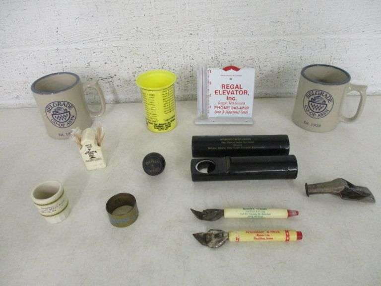 2 - Red Wing Belgrade Co-op Ass'n Mugs, Greenwald Elevator Toothpick Holder, 2 - Melrose Credit Union Bottle Openers, Regal Elevator Rain Gauge, Freeport State Bank Toothpick Holder, Stearns Co-op Electric Ass'n Measuring Cup & More