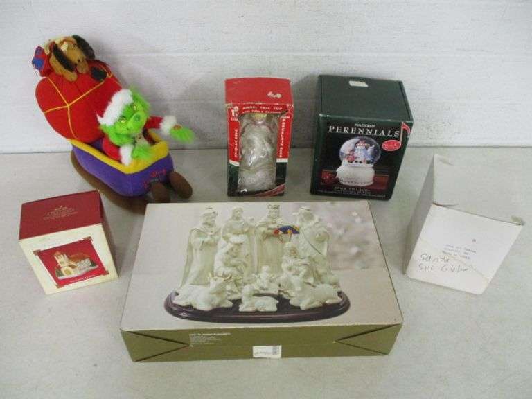 Porcelain Nativity Set, Grinch Sleigh, Angel Tree Top, 2 - Snow Globes, Keepsake Church Ornament