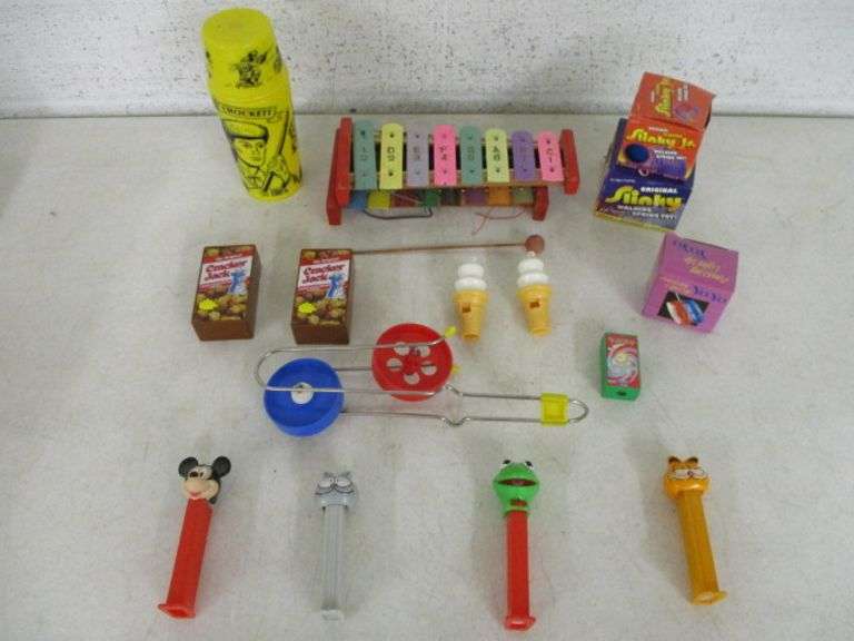 2 - Xylophones, Davy Crocket Shaker (Repaired), Slinky's, Pez Dispensers, Dairy Queen Whistles, Cracker Jack Compass & Magnifying Glass, Durham Speed Control