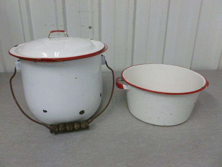LOT 44 - (2) Vintage Red & White Enamelware Pots