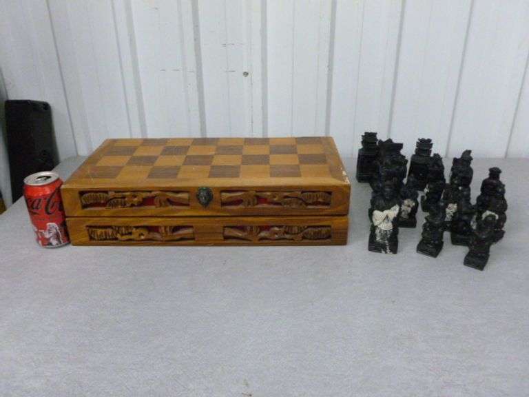 LOT 172 - Large Vintage 1960's Korean Chess Set - Wooden Board - Large Marbled Carved Resin Pieces