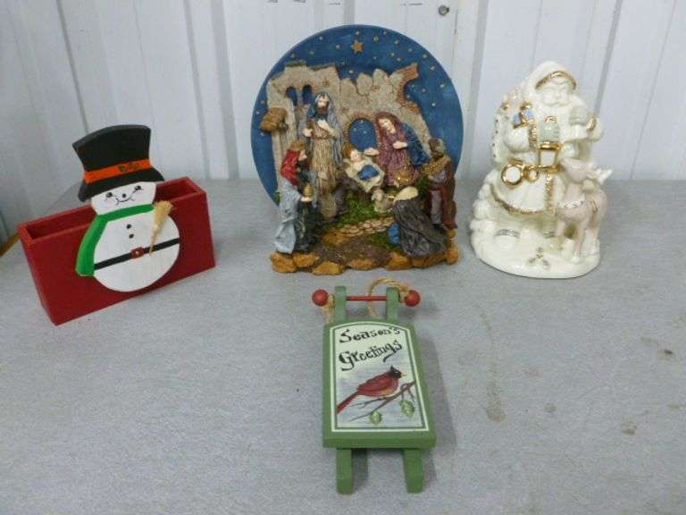 LOT 81 - Group Of Nice Christmas Decor Items - 8" Porcelain Santa - Nativity Plate Scene