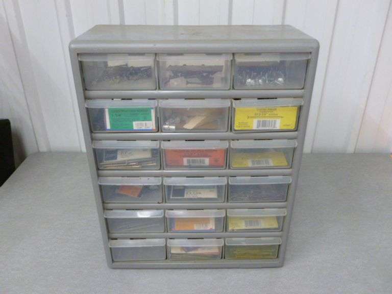 LOT 197 - Nice USA - 18 Drawer Poly Organizer / Loaded Up With New Hardware / Handyman Items