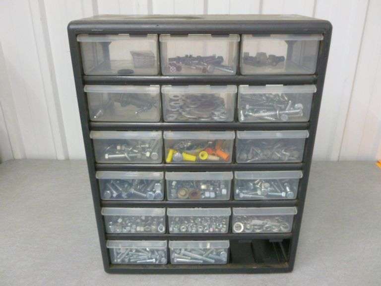 LOT 198 - Nice USA - 18 Drawer Poly Organizer / Loaded Up With New Hardware / Handyman Items - One Drawer Gone