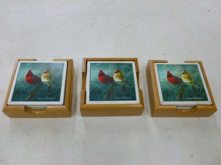 LOT 358 - (3) - 4 Piece Ceramic Cardinal Coaster Sets / With Oak Trays