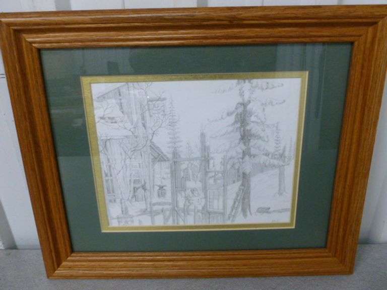 LOT 400 - Nice " Winter Themed " Framed & Matted Pencil Sketch Print 13.5" x 16.5"