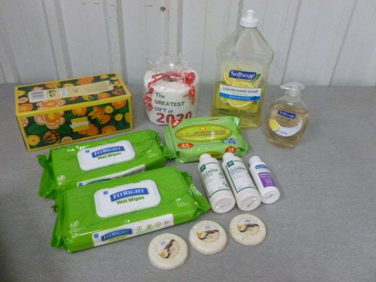 LOT 183 - Group Of Bathroom Items / Hand Soap / New Box Kleenex / New Wipes