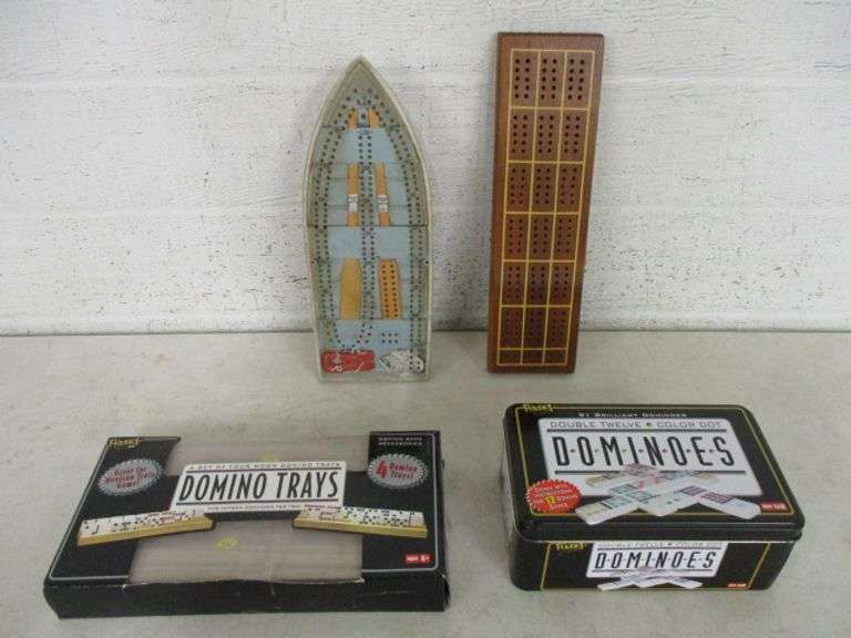 LOT 80 - Dominoes, Trays & 2 - Cribbage Boards