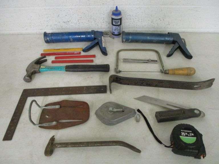 Claw Hammer, Coping Saw, Chalk Line, 25' Tape Measure, Wonder Bar, Cats Paw, T-Bevel, Pencils, Caulking Guns